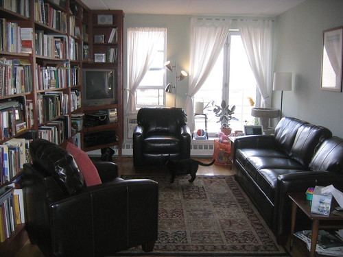 Working from home today, I finally have a few minutes to upload a few pictures of our new sofa set! It’s leather, baby. It can withstand cats and babies alike. It is a sleeper sofa.